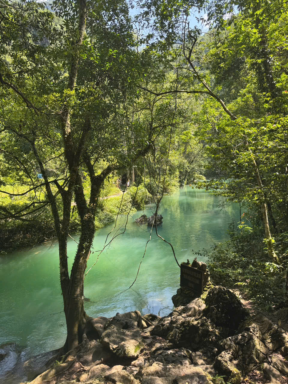 You’ll enjoy stunning panoramic views of deep valleys and towering limestone cliffs. Below, the emerald-green Nho Que River snakes through the mountains.